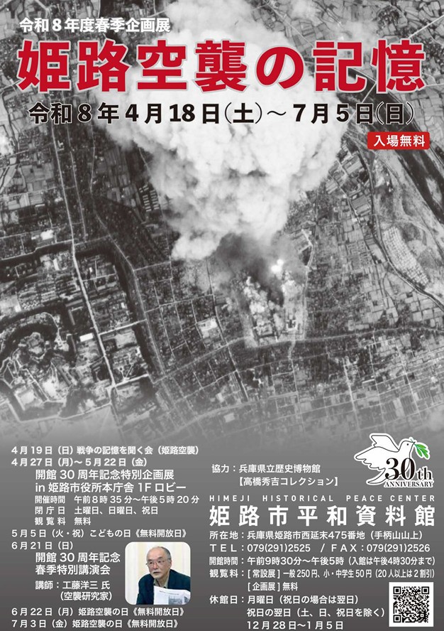 開館30年を迎えるにあたり、姫路空襲についての被害状況や戦前・戦後の変貌ぶりを写真パネル中心に、館蔵資料とともに展示します。また、防空壕の模型にて体感も可能。