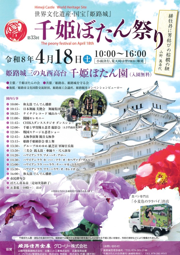 千姫の義父、本多忠政の居館があった姫路城三の丸の高台の「千姫ぼたん園」において、「第33回 千姫ぼたん祭り」が開催されま...