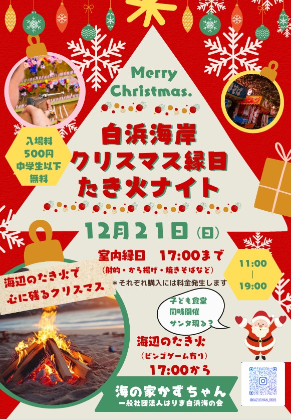 12月21日にクリスマスイベントが開催されます。室内縁日などイベントが盛りだくさん!海辺のたき火で心に残るクリスマスを過...