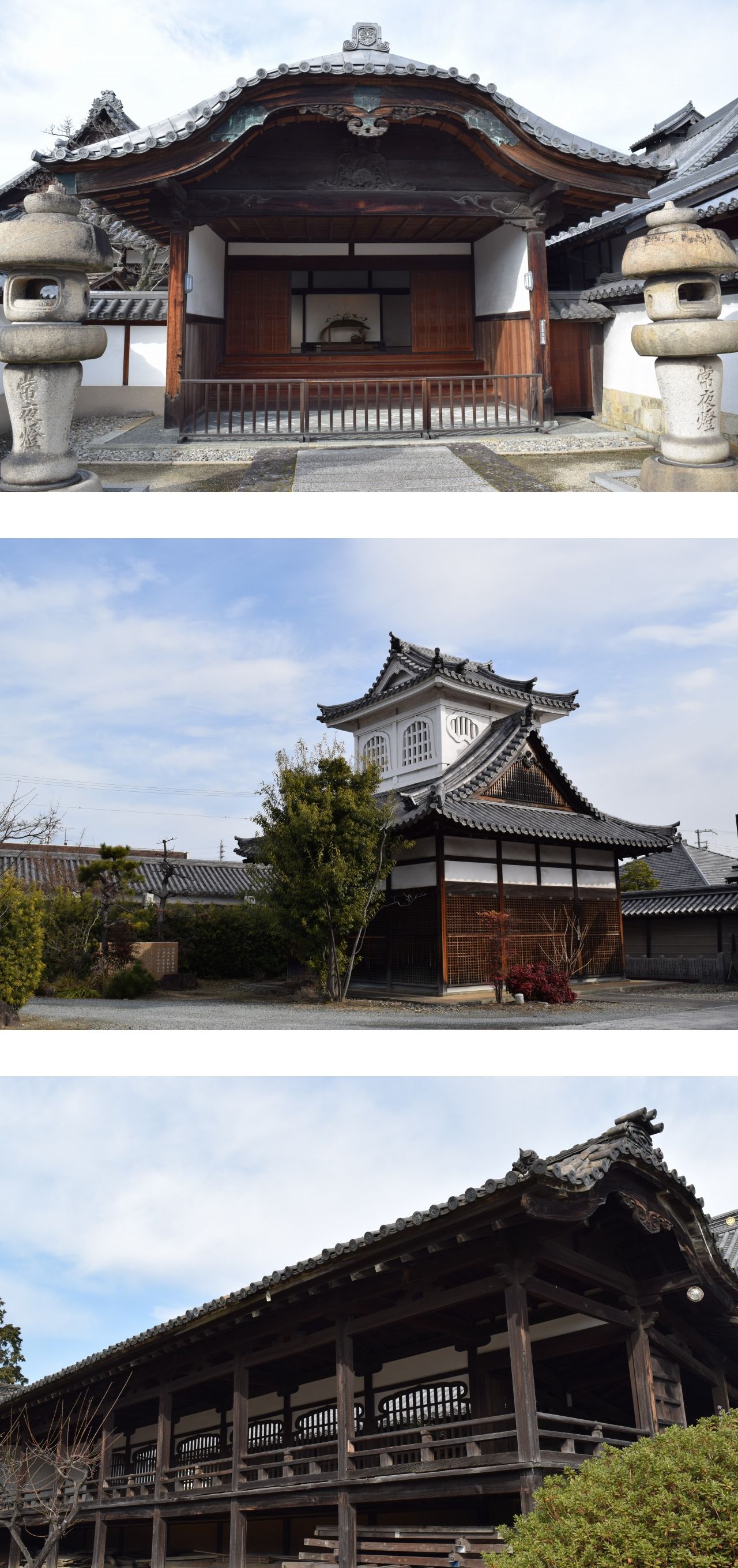 大門は門柱のほかに控柱を4本建てた堂々たる四脚門で、本瓦を葺いた重厚感のある切妻造の屋根にも風格があり、施された組物など細部の意匠にも見るところが多い。