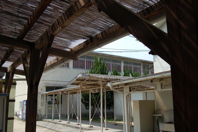たとえばその一つが、曽根天満宮から少し東の、現在は図書館や教育センターとして利用されている木造校舎。県立松陽高校の旧校舎で、屋根が葺き替えられたり、窓サッシがアルミに変わっていたりもするが、現在は図書館として利用されている木製サッシの旧校舎や屋根の付いた渡り廊下、臭い出し?の煙突が付いた、かつてのくみ取り式の便所なども見られ、アングルによっては充分「昭和の学舎」が再現できる。