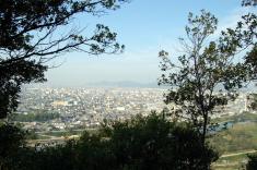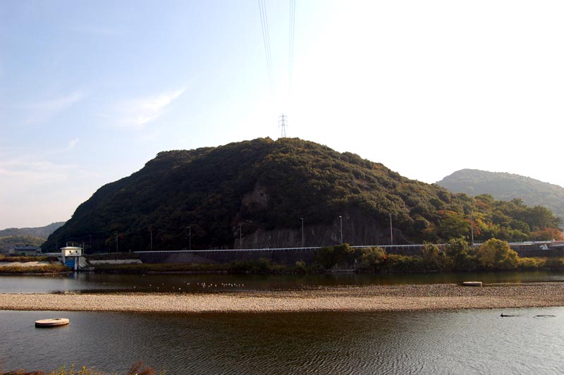 山裾に妻鹿城址の大きな石碑が立ち、その隣にある荒神社の参道脇から城跡に登る道が続いている。6、7年前に初めて登った時は道もそれなりに整備されていたのだが、今はすっかり荒れ果て、登るのに難儀するほど。それでも20分余りかけて登ると、郭(くるわ)の跡らしい平坦な一画に出る。ここからの眺望は素晴らしく、姫路城を初めとする姫路の市街地や海岸線の工場地帯までが一挙に望め、眼下には市川の流れ。地勢的にも戦略的にも申し分のない立地で、職隆がここに城を築いた理由がよく分かる。