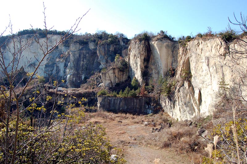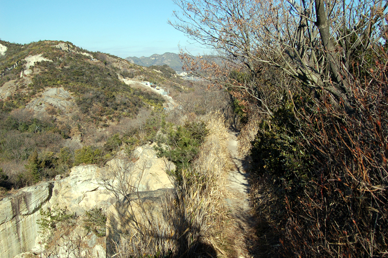 その観濤処に続く細い尾根道は、登るにつれ数十メートル下に広がる石切場が大きく口を開けて待ち受けているような感じになり、落ちはしないかと次第に背筋が冷たくなってくる。特に後半の数メートルは左右が切り立った石切場となり、その間の道幅はわずか1メートル程。ガードレールはもちろん落下防止用の紐なども渡ってなく、高所が苦手な私などは下を見るだけで思わず足がすくんでしまい、少しでも風があれば歩く自信がない。つまりそれだけスリルやサスペンスが求められるドラマには打ってつけの場所だということで、画面を通して手に汗するシーンが描けるだろう。