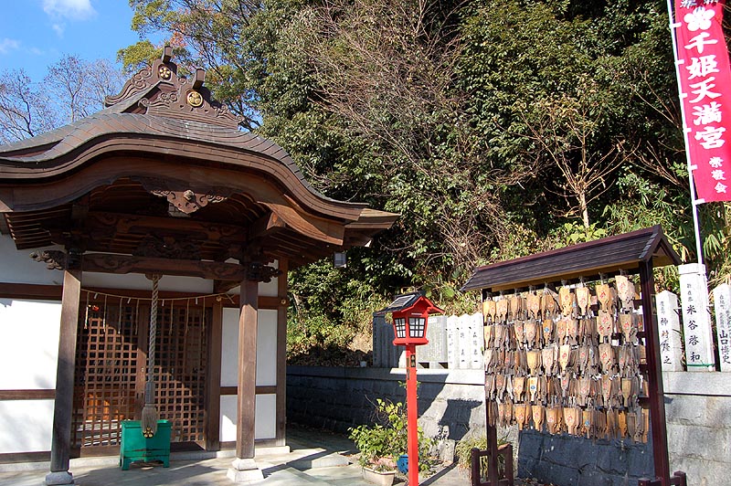 清水門跡から西に向かうと水尾神社があり、背後の男山の山腹に男山八幡宮が、その山裾に男山千姫天満宮が鎮座している。前回も紹介したように天満宮は千姫自らが建立し、愛蔵の羽子板を奉納して願をかけたことで知られており、小さな境内には参拝客が奉納した羽子板の絵馬も数多く見られる。