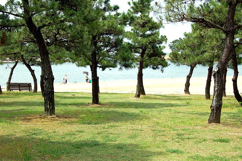 公園は「日本の白砂青松100選」にも選ばれており、松林に囲まれるように小さな砂浜が広がり、この時期、水遊びをする親子連れでにぎわっている。一帯にはベンチやトイレなどの人工構造物が設けられているので、歴史ドラマには少々無理があるが、夕陽を浴びた松林は映像的にも魅力があるし、松林を背景に長い髪を潮風になびかせるヒロインを立たせたいところだ。