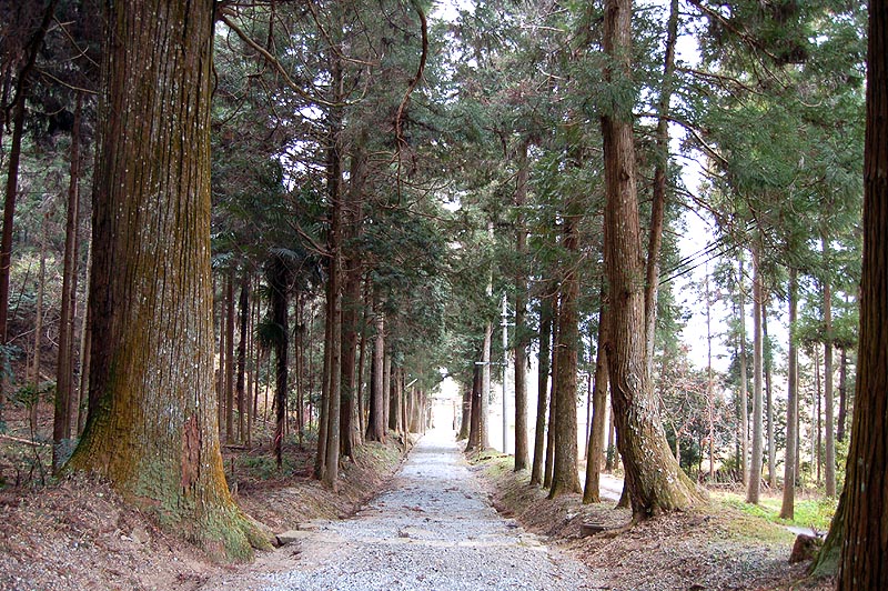 この千本公会堂から北に上がっていくと、宇府山神社がある。今回の一番の注目がその参道に沿って続く杉並木。道幅2〓3メートルほど、距離にして100メートルほどのまっすぐに伸びた参道の両側に30本以上の杉の木が植わっている。まだ若い木が多いが、手前右側には樹高約22メートル、幹回り約5メートル、推定樹齢300年の市指定天然記念物の大きな杉の木があり、とらえようによっては参勤行列の一行が進む江戸時代の街道に見えなくもないし、目立つ人工構造物もないので時代劇のワンシーンに取り込むこともできる。