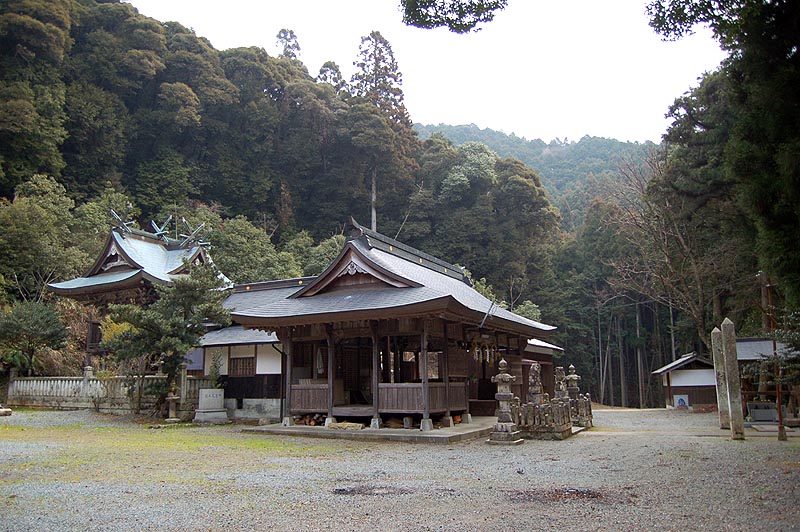 ひっそりと静まり返った境内にも大きな杉の木が枝を伸ばしており、本殿、拝殿も歴史を感じさせ、農村歌舞伎の舞台のような建物も見える。侍たちの争闘シーンも描ける広い境内、苔むした狛犬などにもつい目が行く。