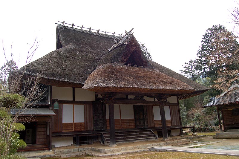瓦葺きとは違って一見素朴なようにも感じられるが、格調のある質感、柔らかな屋根のラインなどはむしろ豪壮という言葉がふさわしく、深い軒先に目にすることができる障子戸の陰影の美も相まって、雪深い山国にひっそりとたたずむ由緒ある寺院という設定が考えられそうである。