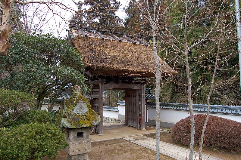 この御屋敷跡にも増して映像的な魅力にあふれているのが、福本藩池田家の菩提寺である一関山徹心寺。陣屋造営時の創建で、位置的には御屋敷跡から県立神崎高校を間にはさんだ北西の、少し小高くなったところにあるのだが、山門も本堂(兵庫県指定文化財)も全国的にも珍しい茅葺きの屋根で、独特の味わいを見せている。