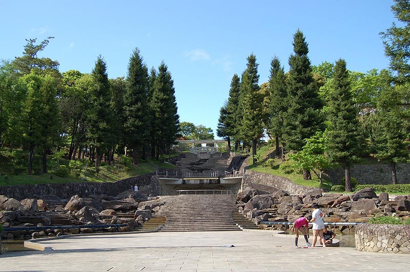 JR姫路駅に近い市街地の、2つの小さな丘の上に広がる手柄山中央公園。2003年6月号のメルマガでは、公園の北端にあるヨーロッパの古城を思わせる建物群(ロックガーデン)を紹介したが、今回は、この公園の最大の魅力である都市公園らしい洗練された美しいロケーションを紹介したい。公園の玄関口に設けられたカスケード。両側に針葉樹を従えた長さ150メートルもある石段が続き、それに左右非対称の7つの小滝が交わり、涼やかな瀬音を立てている。下から石段を見上げると美しくのびやかな構図が開け、家族連れよりは恋人たちを歩かせてみたいロマンティックな雰囲気にあふれている。