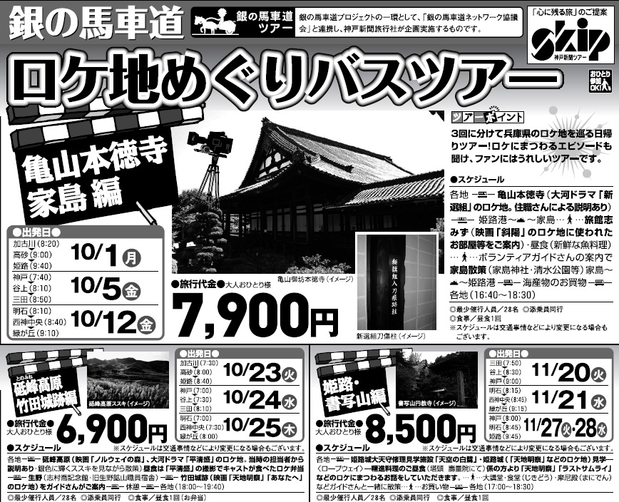 銀の馬車道沿線(姫路市、福崎町、市川町、神河町、朝来市)にある映画・ドラマのロケ地をめぐる3回シリーズの日帰りバスツアー!ロケ地で撮影秘話を聞いたり、沿線のグルメ・観光が楽しめます。 | |||