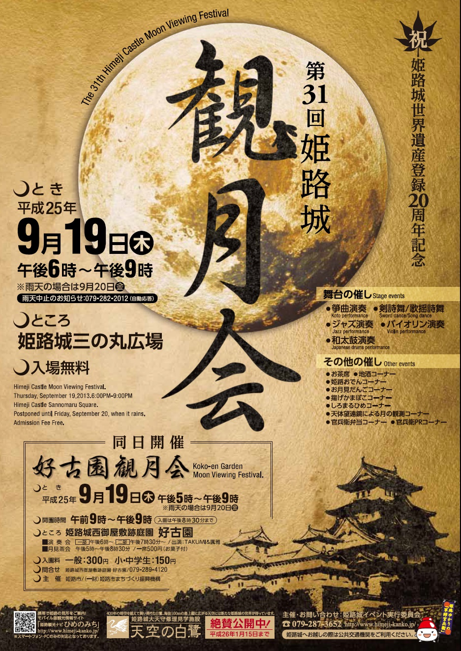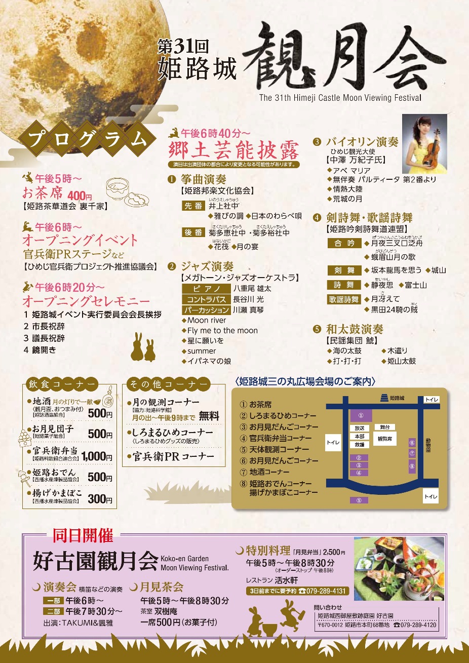 ○ | 第31回姫路城観月会 <姫路城> 姫路城三の丸広場内に設けられた特設ステージで、中秋の名月にあわせて姫路城観月会が開催されます。 LEDライトでライトアップされた姫路城(天空の白鷺)をバックに、琴やヴァイオリン、和太鼓演奏などの姫路の郷土芸能が披露され、グルメブースでは姫路・播州の地酒や月見だんご、官兵衛弁当などの販売やお茶席、月観測コーナーもあります。また、会場内では、しろまるひめのグッズ販売も行われます。