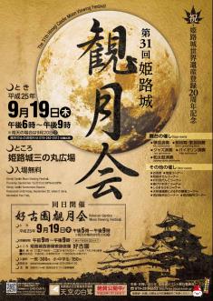 | ○ | 第31回姫路城観月会 <姫路城> 姫路城三の丸広場内に設けられた特設ステージで、中秋の名月にあわせて姫路城観月会が開催されます。 LEDライトでライトアップされた姫路城(天空の白鷺)をバックに、琴やヴァイオリン、和太鼓演奏などの姫路の郷土芸能が披露され、グルメブースでは姫路・播州の地酒や月見だんご、官兵衛弁当などの販売やお茶席、月観測コーナーもあります。また、会場内では、しろまるひめのグッズ販売も行われます。