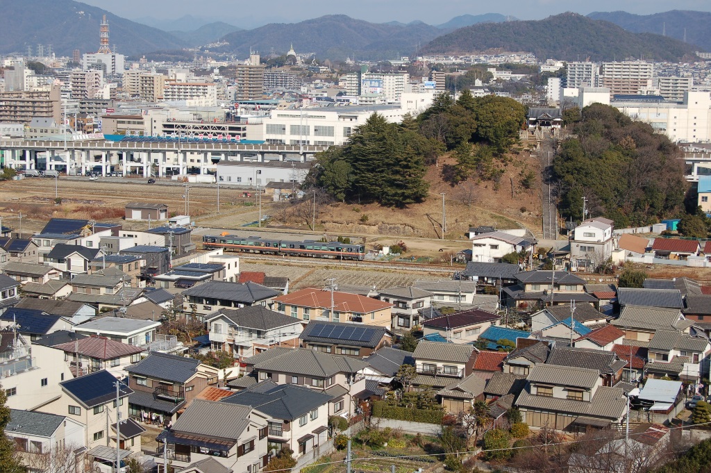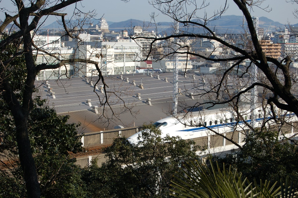南側には最初に紹介した手柄山があるが、少し視線を下げるとJR神戸線の高架橋があり、「トォー、トトトン…」と走行音を響かせて走る普通列車やコンテナを積んだ貨物列車が見える。さらに顎を引くように手前に視線を移すと、踏切の警報音が鳴り響く中、ローカル線らしい1両編成の姫新線のディーゼル車が「ガタン、ゴトン…」と、ゆったりしたリズムを打ちながら走っている。加えて神社の裏手からは新幹線の高架橋が見下ろせ、地の底から唸るような音を響かせながら色も形もさまざまな車両が走り抜けていき、その向こうには新しく白く蘇った姫路城が浮かんでいる……。