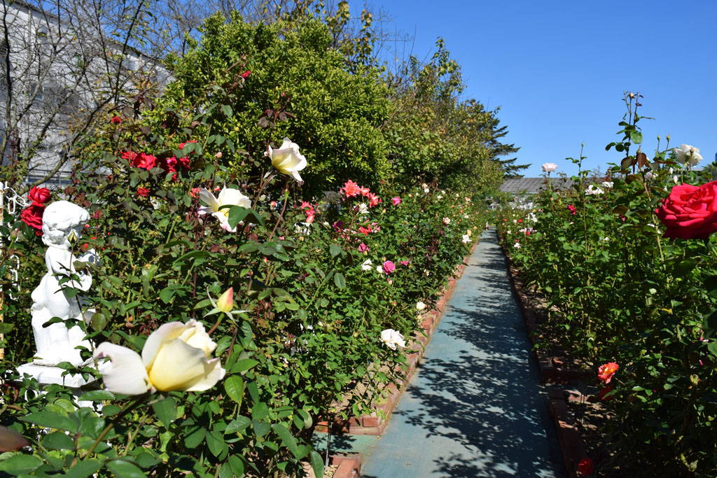 姫路の市街地から北へ、市川と矢田部川が合流する国道312号線に近い三角州状の地点に今回紹介する「姫路ばら園」がある。20歳になったばかりの息子さんを交通事故で亡くした上野修さん・昭子さん夫妻が、鎮魂の意味を込めて昭和52年(1977)に開園した私設のバラ園である。ご承知のように、バラは春と秋に開花シーズンを迎える。花が大ぶりで香りが豊かな春(5月中旬〓6月中旬)に対して、花色がより鮮やかなのが秋(10月中旬〓11月中旬)ということで、訪れた日の秋のバラは抜けるような青空の下、透明感のある赤やくすんだ深紅、柔らかな日差しを跳ね返す白やピンクの花色が冴えわたっていた。まさに「花園」で、どこか夢見心地にさせてくれるのである。