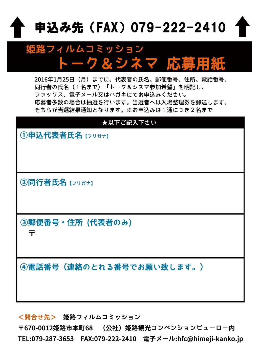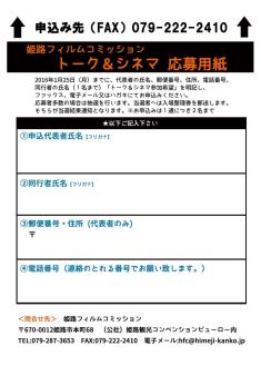 | ■申込先 | 〒670-0012本町68 「姫路フィルムコミッション・トーク&シネマ」係 (Tel287-3653・Fax222-2410・電子メールhfc@himeji-kanko.jp) |