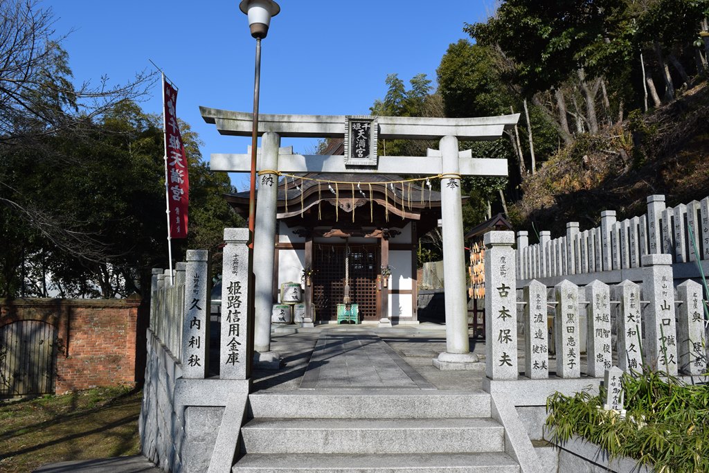 姫路城のすぐ西に小高い山がある。姫路城がそびえ立つ「姫山」に対し「男山」と呼ばれ、まるで「夫婦(めおと)」のように寄り添っている。山裾には水尾神社があり、中腹には千姫天満宮と男山八幡宮がある。千姫天満宮は、徳川二代将軍秀忠の娘で、姫路城主本多忠政の嫡男忠刻に嫁いだ千姫が建立した神社で、自らが信仰していた天神(菅原道真)の木像を祀り、姫路城内の西の丸長局から遥拝したという。