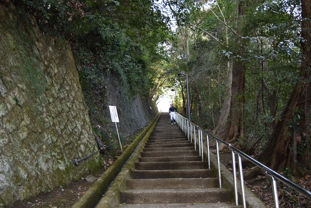 石段は山の北側にも設けられている。南側ほど急斜面ではないが、それでもなかなかきつい勾配で、近隣の高校の運動部のトレーニングによく使われている。