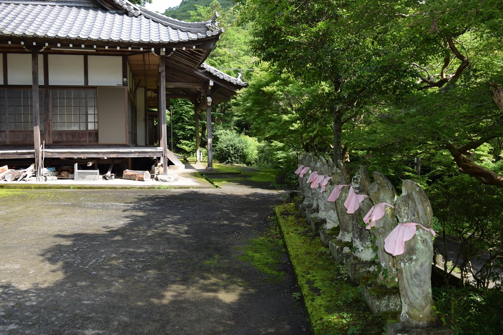 前置きが長くなったが、市街地を抜ける県道518号線から少し北西に入ったところにそうめん滝がある。墓地の手前に道標があり、少し歩くと東南寺という無住の小さな寺。いかにも人里離れた寺という雰囲気で、苔むした山の斜面に続く境内に弘法大師の像が立ち、数体のお地蔵さまがじっとと佇むなど、「昭和」が薫りくるような味わいを見せている。