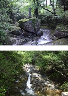 修験道の行場なのだろうか、少し上流には巨大な岩があり、不動明王の石像が祀られている。岩の横から水が滝となって滴り落ちており、行者はこの水に打たれて修行したのかもしれない。
