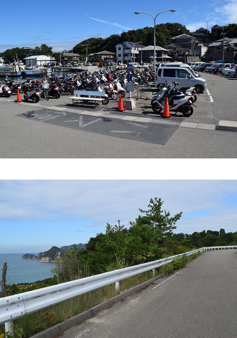 姫路港を出港した船はいずれも約30分で坊勢島の玄関口である奈座ターミナルに到着する。ここが定期船の船着場で、岸壁には本土に船で渡る通勤客らが停め置いたバイクがズラッと並んでいる。道が狭く、アップダウンが多い島ではバイクが一番便利な交通手段で、オーバーではなく、数メートル歩くたびにバイクと遭遇する。まさに「バイクの島」で、膨大な数の漁港の漁船とともにバイタリティあふれる島の様子が映し出せる。