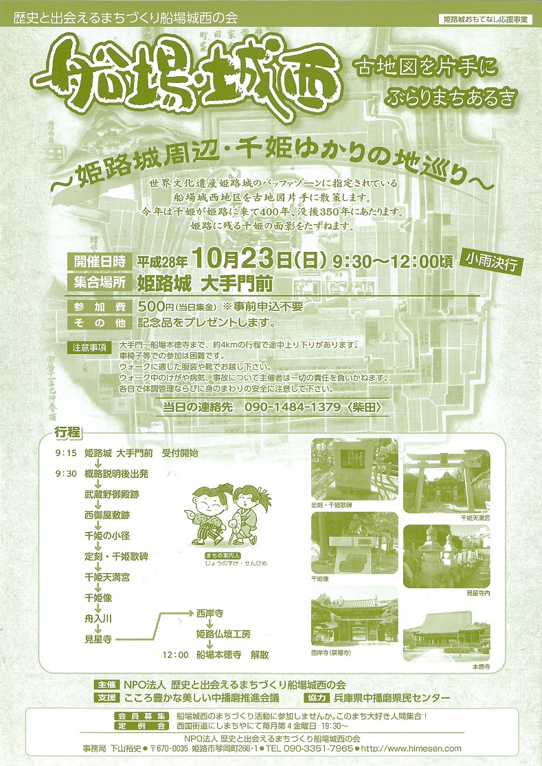 世界文化遺産姫路城周辺の船場城西の古地図を片手に散策します。今年は千姫が姫路に来て400年、没後350年にあたります。姫路に残る千姫の面影をたずねます。