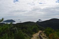 前置きが長くなったが、今回のイチオシは360度の大パノラマが開け、家島諸島の島々が俯瞰できる「かしわの山展望台」。奈座ターミナルから反時計回りに歩き、海水浴場の横を抜けて新興住宅が建ち並ぶ手前の坂を上っていくと、みかん園の入口の先に展望台への登り口がある。ここまでは舗装された快適な道で「オカズラ林道」と呼ぶらしいが、時おり木陰の間から瀬戸の海が開け、ガードレール越しに幾つかの美しい島影が望める。ごく限られた生活道路なので、すれ違う車もなく、現代物のドラマはもちろん、CMの撮影にもオススメの道である。