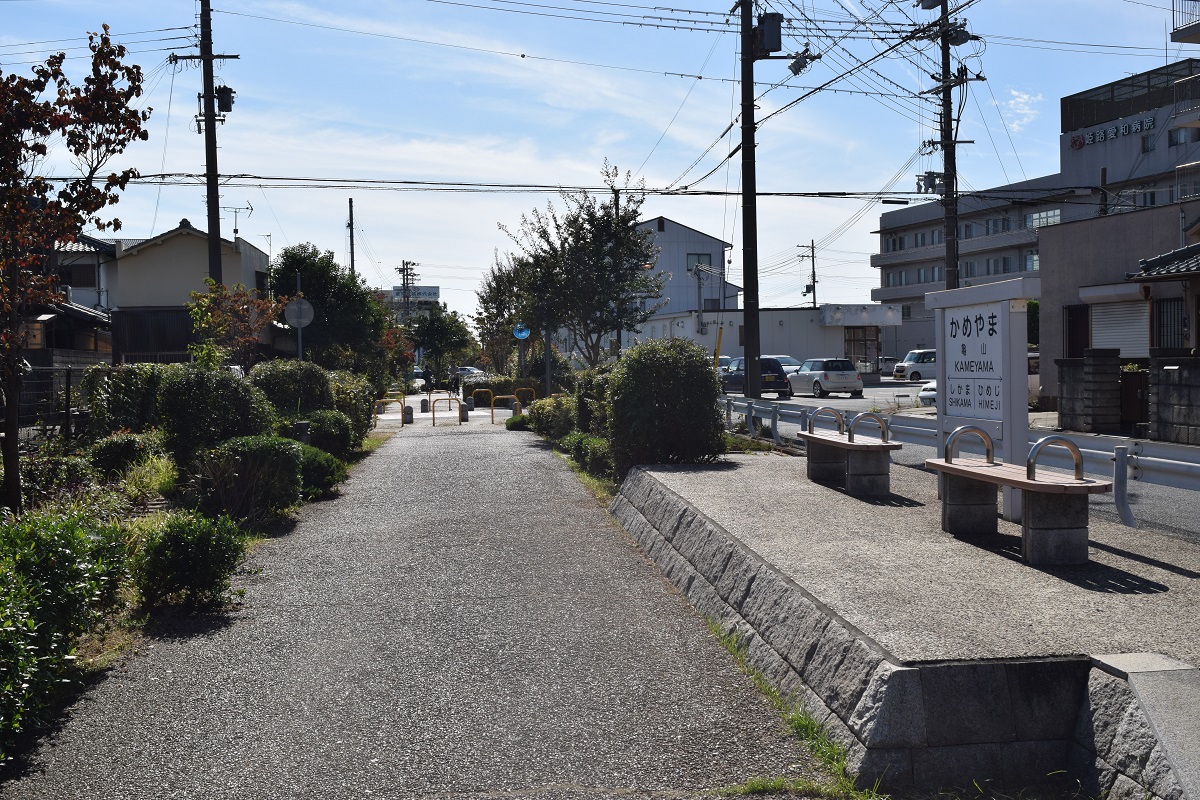 廃線跡の遊歩道はほぼ直線を貫き、姫路バイパスの高架橋の下を潜ると、旧国鉄亀山駅を偲ばせるホーム状のモニュメントが設けてあり、道路際の倉庫には「国鉄姫路駅前」と記された看板も掛かっている。