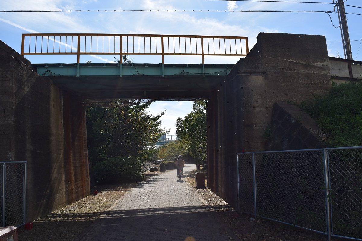 遊歩道はなおも南西方向に伸び、市立飾磨中部中学校の横を抜け、かつては跨線橋だった山陽電鉄網干線の橋の下を潜っていく。橋を支える擁壁は国鉄当時のままで、レトロな味わいがある。