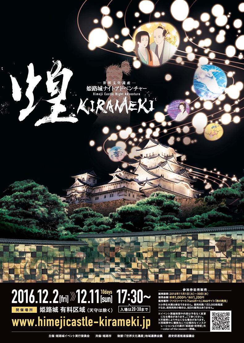 夜の姫路城を周遊する姫路城での光イベントを開催。三国堀、西の丸、お菊井戸など姫路城内の各スポットでプロジェクションマッピングなどの手法を使って、歴史上・姫路城ゆかりの人物、400年の歴史等、鮮やかな映像、迫力ある音響による演出で姫路城内を冒険。