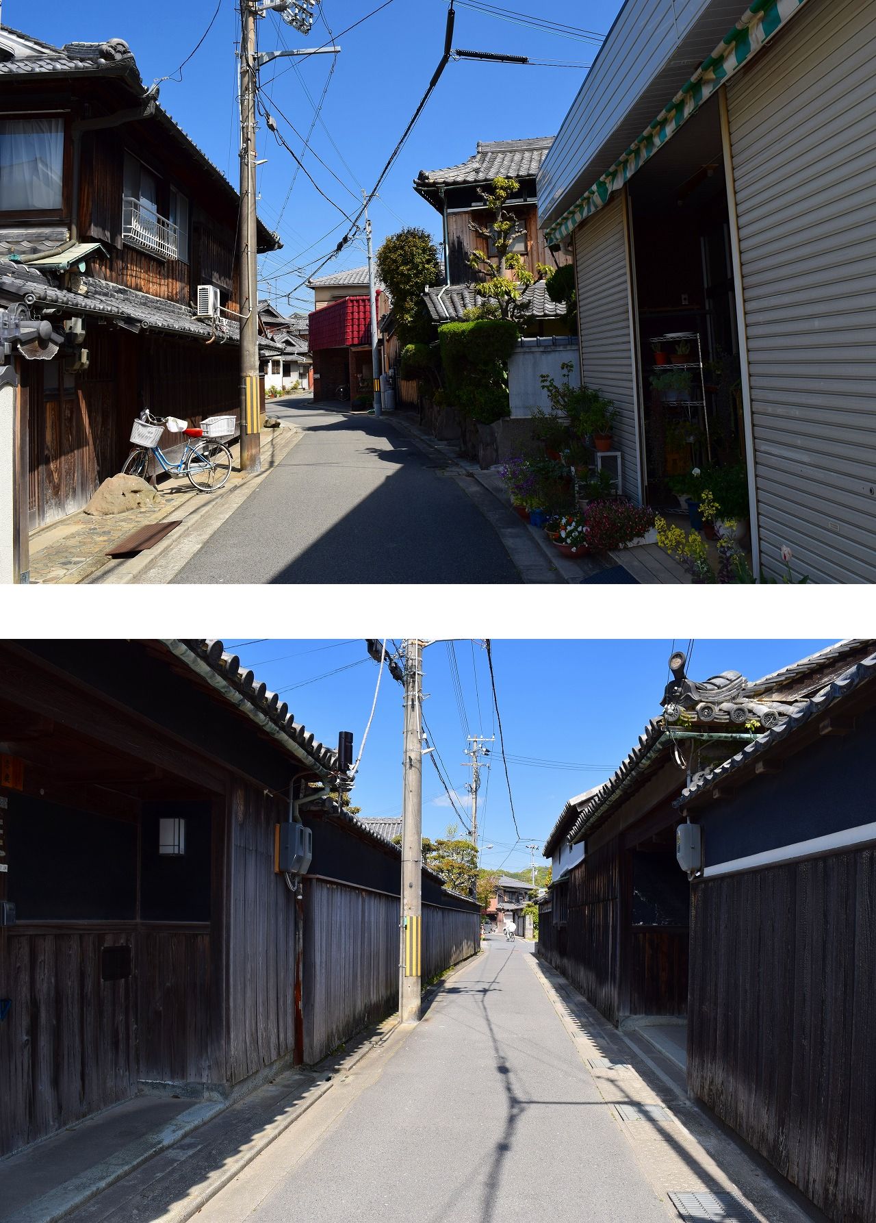 そこから北東に、路地に迷い込むように歩いていると、煙出しの越屋根を置いた豪邸や、白い漆喰壁の蔵が印象的な屋敷、門の向こうに障子戸がのぞく小粋な民家などが見られる。そばに建つ電柱がコンクリート製なのが残念だが、工夫すればある程度は時代を遡った舞台設定ができそうである。