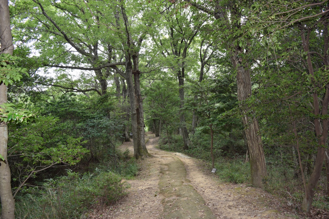 木々の間を縫って続く散策路は目立った人工構造物も少なく、山中を走る江戸時代の街道に見えなくもないが、簡易舗装が施されていたり、階段状になっているところもあるので、ただちに時代物の街道に見立てるわけにはいかないが、場所によっては散策路の脇に枯葉が降り積もった土道もあり、こちらの方は充分使えそうである。