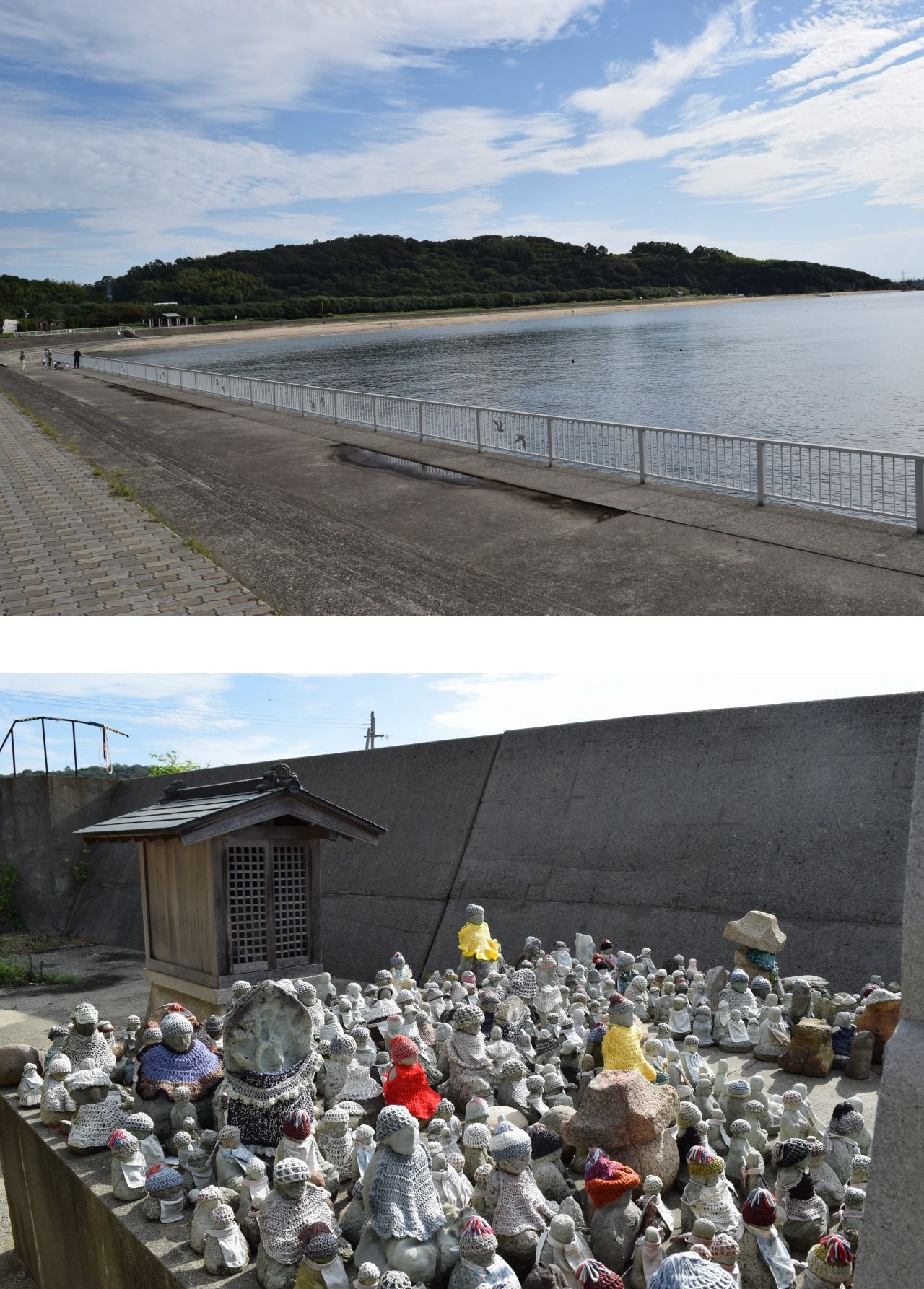 一方、港の東側の海岸近くに鎮座しているのが鎌倉中期の作と考えられている「八家地蔵」である。高さ1.9m、花崗岩製の精巧な丸彫りで、地元の方の話によれば子授けに霊験あらたかでなことから「子授け地蔵」とも呼ばれているそうで、周囲には毛糸のよだれかけや帽子をまとった小さなお地蔵さんがぎっしりと並んでおり、ほほえましさを醸し出している。