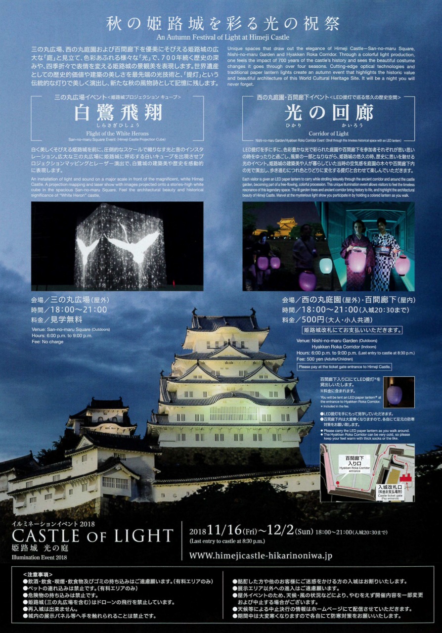世界遺産登録25周年を迎えた姫路城では、2018年11月16日(金)から12月2日(日)までの17日間、ナイトイベントとして「姫路城 光の庭 Castle Of Light」を開催します。