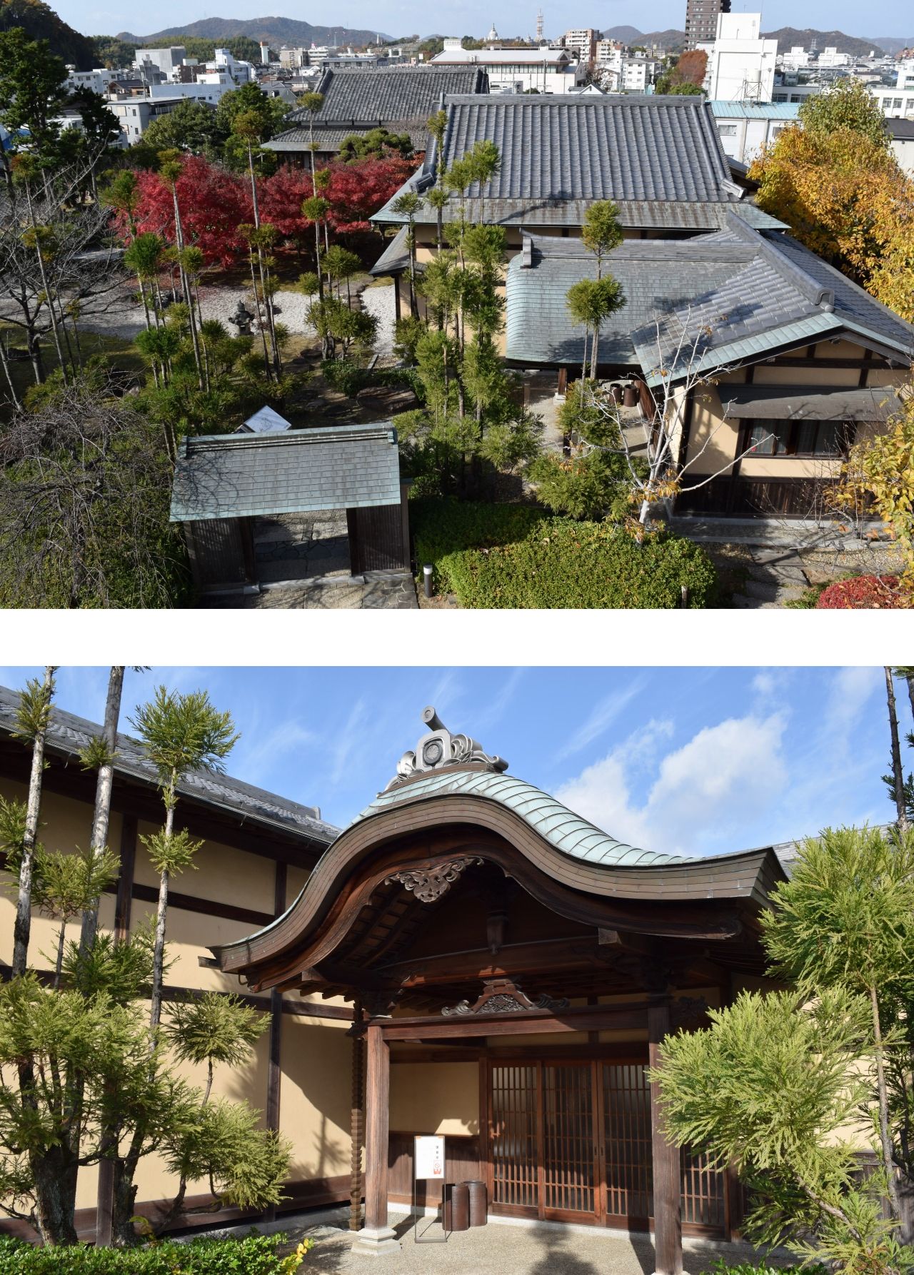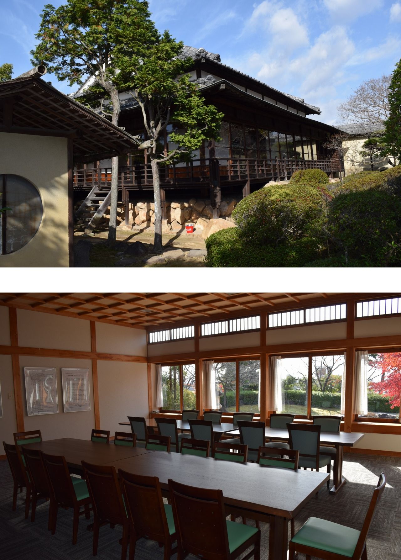 以上、建物の内部をざっと見てきたが、池泉が設けられ、腰掛待合もある緑豊かな庭から眺める和室や茶室、応接室にも味わいがある。また、建築当時のまま移築されたという裏千家十五世千宗室氏が揮ごうした「望景亭」の扁額が掲げられた棟門も見どころの一つだと言えるだろう。