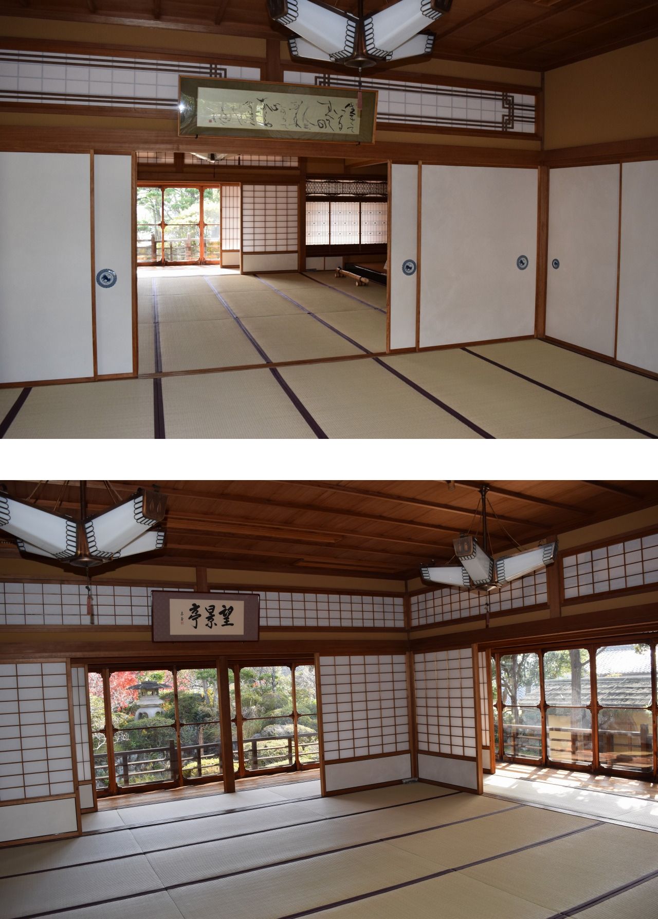 大きな唐破風の玄関から中に入り、映像に捉えておきたい、まず1つ目が茶室。廊下から茶室に向かうと正面に派手な色彩の板戸絵(望景亭には計8面ある)が待ち受けており、右手にあるのが水屋と8畳の茶室。障子の引手、網代天井、トコ脇前の船底天井など見るみるべきところが多い造作の〓粋〓を集めた和室で、開口部が広くとられているので庭園を望む風情も申し分ない。大正から戦前ぐらいまでの富裕層のお茶席という設定ができそうだ。