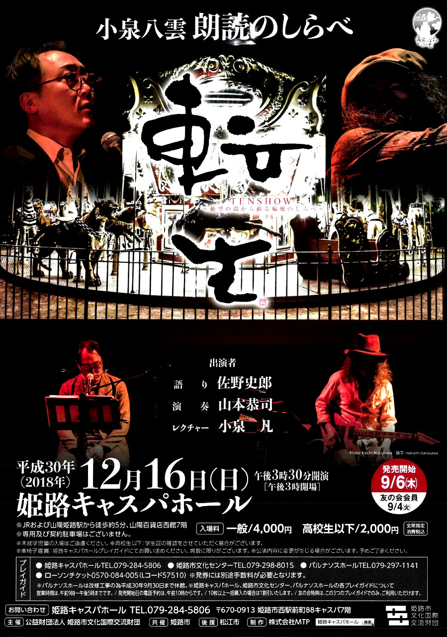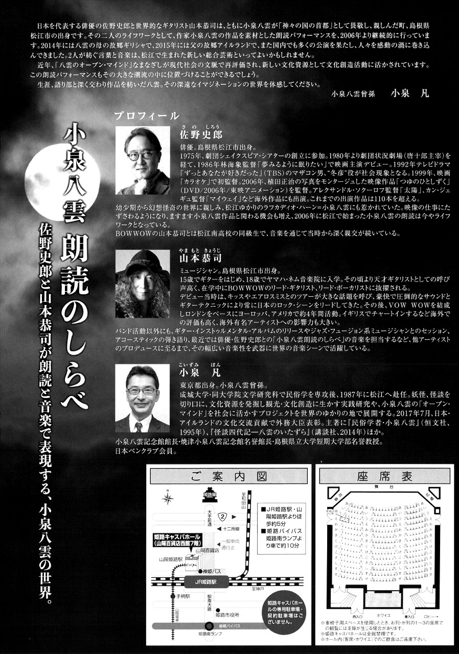 「耳なし芳一」「ろくろ首」「雪女」などの作品で知られる作品で知られる作家ラフカディオ・ハーン(小泉八雲)が最も愛したまち、島根県松江市出身であり、高校時代の同級生でもある俳優・佐野史郎さんとギタリスト・山本恭司さんがお届けする朗読パフォーマンスです。