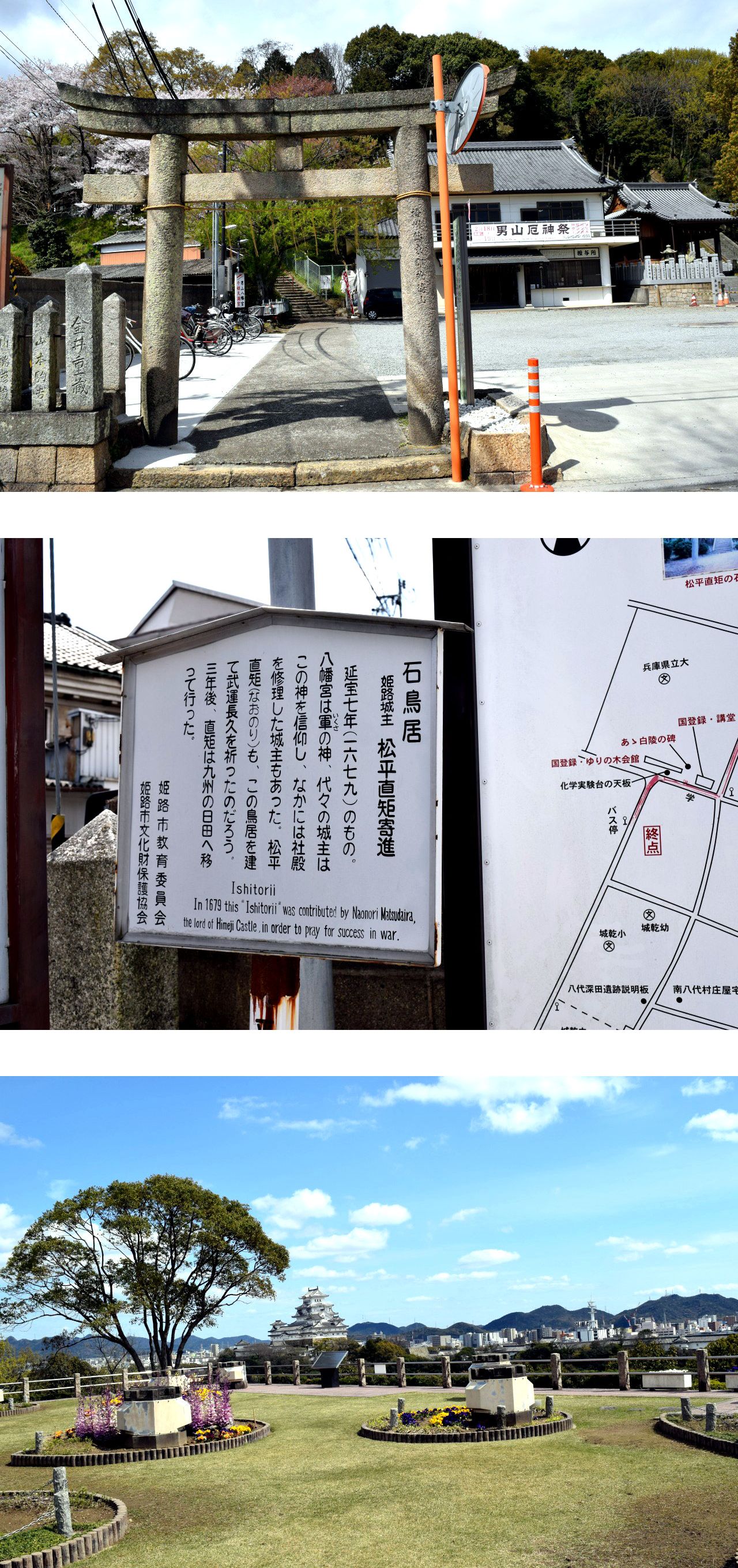 このほか神社の社殿の前には正徳6年(1716)に時の藩主・榊原政邦が寄進した石鳥居があり、参道脇には元和9年(1623)に千姫が夫の本多忠刻の病気平癒を願って建立したと伝わる千姫天満宮もある。また、男山の山頂は配水池公園になっており、そこからは姫路城の天守群だけでなく西の丸までが一望できる。姫路城十景の1つに選ばれているビューポイントで、ぜひ映像に取り込みたいところ。さらには山麓から山頂まで、運動部の選手などに走らせれば絵になる急勾配の石段が続いており、ロケ地として多彩な魅力を醸し出している。