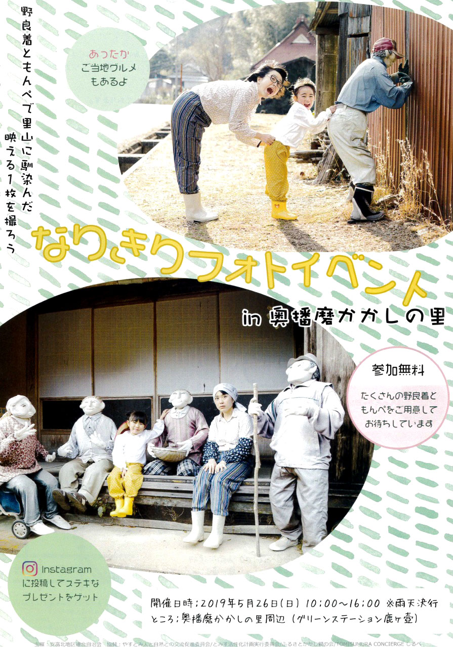 | 内容 | : | 奥播磨かかしの里には130体のかかし達が暮らしています。 野良着やもんぺなどに着替え、住人達になりきり里山に馴染んだ『馴染映え』の一枚を撮ってインスタに投稿する内容です。 投稿作品の中から『馴染映え』している素敵な3枚には特産品がプレゼントされます。 イベントを盛り上げるためのグルメやパークヨガも開催されますのでお子さんと是非、参加してください。