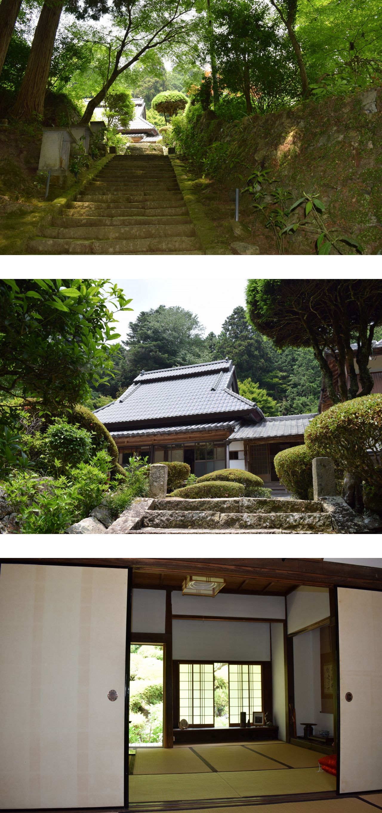 山門から本堂に至る苔むした石段も魅力的だし、山裾から続く参道の両側にはヒノキやスギの大木がそびえ、その合間に青々としたモミジの葉が顔を覗かせている。紅葉の頃はさぞ美しいに違いなく、アスファルトの道だが土舗装すれば武士や商人などが行きかう峠道に変身させることができるだろう。