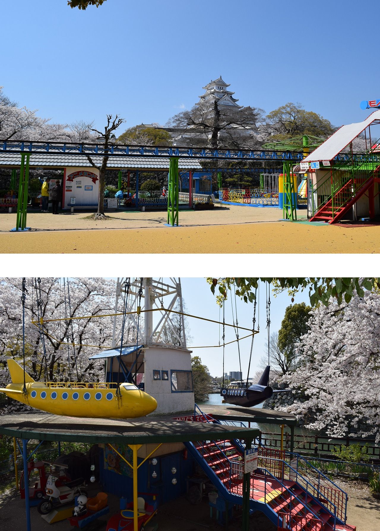 中でも最も「昭和」を感じさせ、懐かしい心持ちにさせてくれるのが城の内堀に面した遊戯施設コーナー。あるのは観覧車と飛行機、新幹線っぽい列車だけだが、いずれも設置されたのは昭和39年。東京オリンピックが開催された年で、ペンキこそ何度も塗り替えられているものの、乗り物の躯体自体は昔のまま。桜越しに姫路城が望める、二人が乗ればぎゅうぎゅうの屋根もない小さな観覧車。ゆったりと走る、開通当初の新幹線に似た列車。お城の堀を見下ろしながらぐるぐると回る飛行機……。観覧車も飛行機も列車も料金は200円と、これまた「昭和」なのが嬉しい。