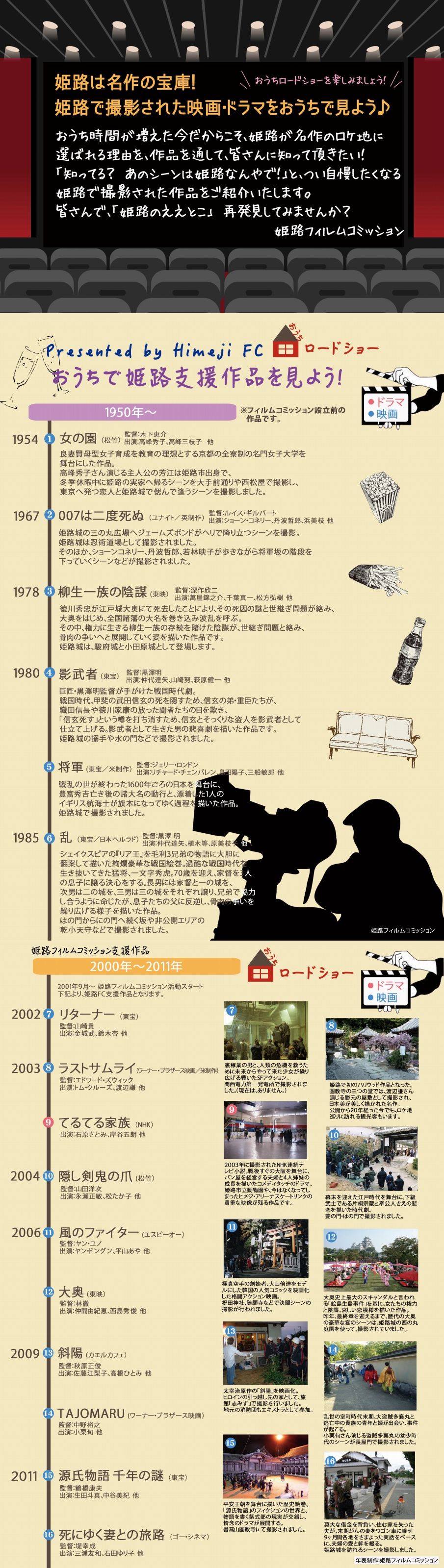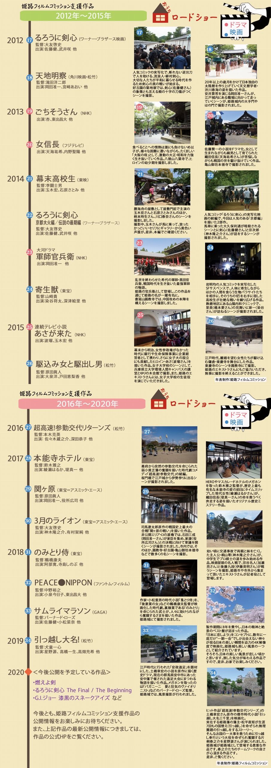 おうち時間が増えた今こそ、姫路が名作のロケ地に選ばれる理由を、作品を通じて、皆さんに知って頂きたい!「知ってる?あのシーンは姫路なんやで!」と、つい自慢したくなる姫路で撮影された作品を年表形式でご紹介いたします。