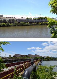 運河といっても観光名所の小樽運河などと違って、水の流れすら感じられない茶褐色に淀んだ水、川の中に足を踏ん張る感じで存在感を示している高圧電線の鉄塔、南側の製鉄所の色のくすんだ工場建屋や縦横に走るパイプライン、どこか緑そのものが色あせた感じの散策路などが続く北側の緑地帯……。殺伐としたというか、殺風景というか、余韻に乏しいというか、「川イコール美しい、清らか」というイメージの対極にある「ダーティーな貌を持つ川」が厳然と存在しているのである。