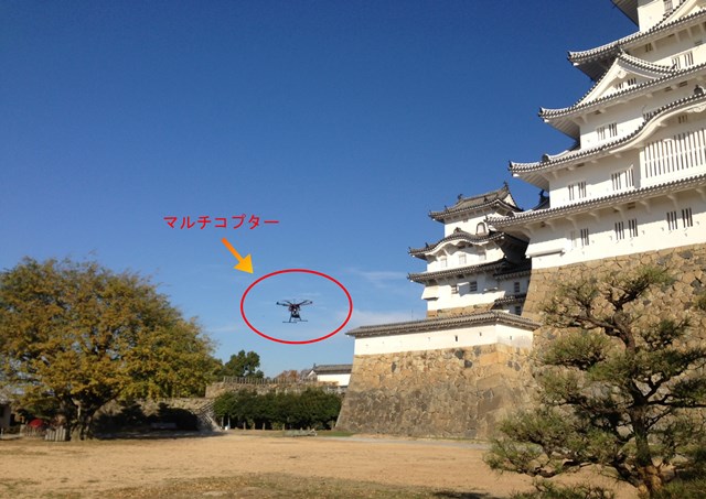 今回は、ヘリコプターではなくマルチコプターという直径1mほどの空撮機材を使用しての撮影。この機材の利点は、姫路城の白い瓦の近くまで寄って行けるので、鳥と同じような目線で姫路城の美しい細部に迫ることができます。