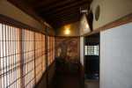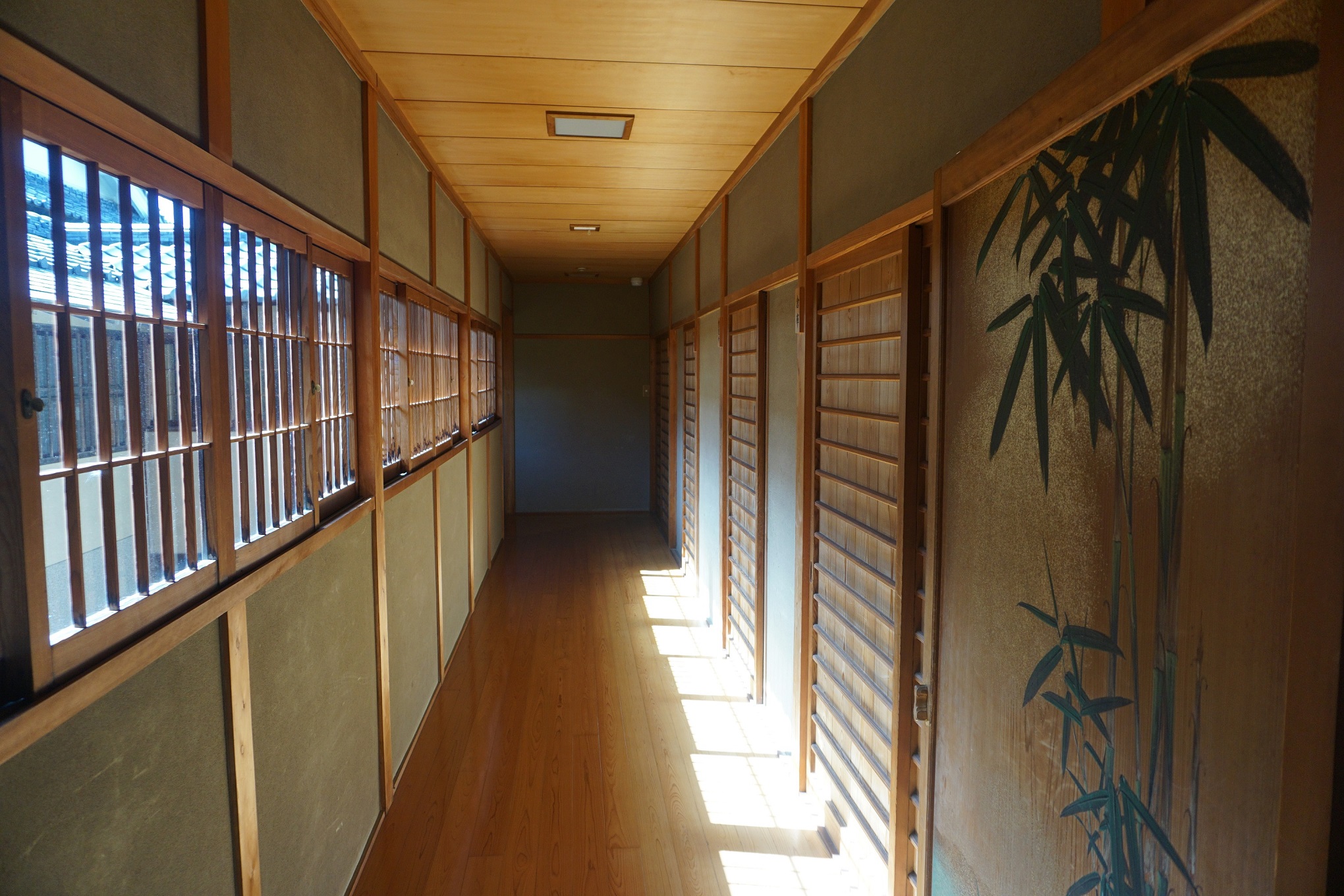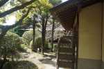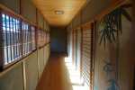コメント | 大正期に建てられた日本家屋を補修したもので、40畳の和室と茶室を備えている。和室と茶室を矩折れに繋ぐ廊下で、延長9.6mの木造平屋建、招屋根桟瓦葺。自然石を乱積風に見せる基礎上に建ち、外壁は土壁で腰モルタル洗い出し。廊下の南北にある庭を往来するための通路を跨ぐために足下をアーチ状につくる特徴的な外観。 |