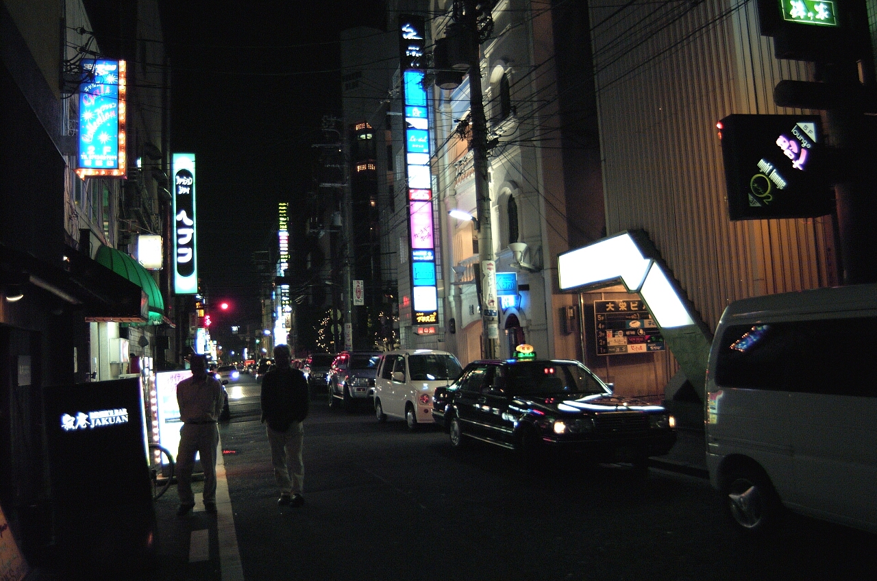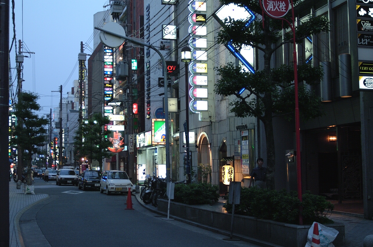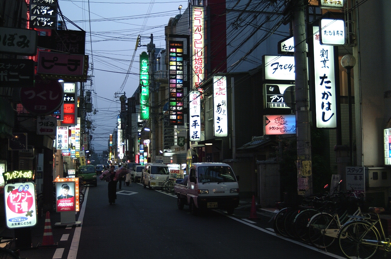 コメントネオンがまたたく姫路の盛り場、夜の歓楽街。