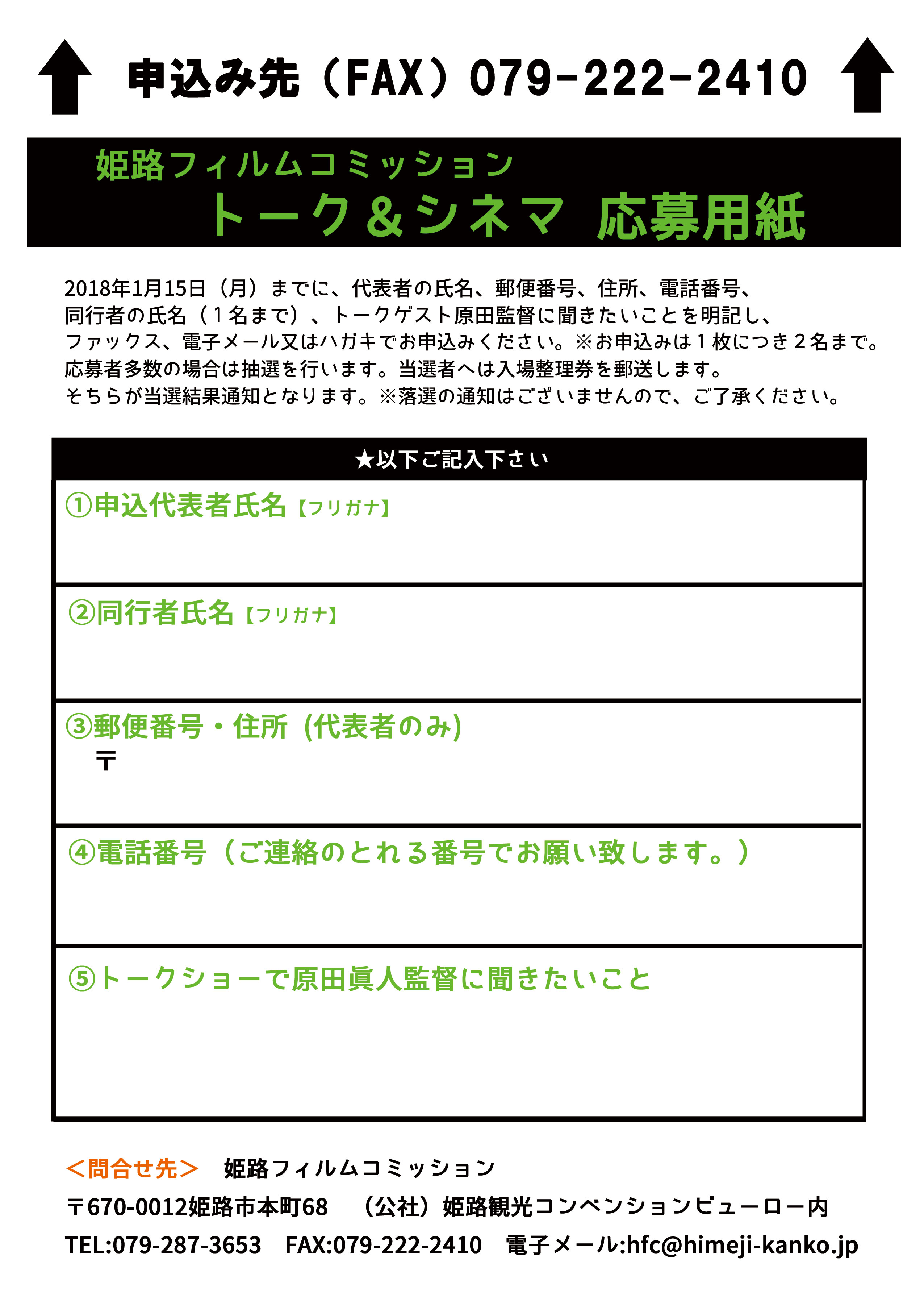 平成30年1月15日(土)までに、代表者の氏名、郵便番号、住所、電話番号、 同行者の氏名(1名まで)、「トークショーで原田監督に聞いてみたいこと」を明記し、はがき、ファクスまたは電子メールで申込み。応募者多数の場合は抽選。