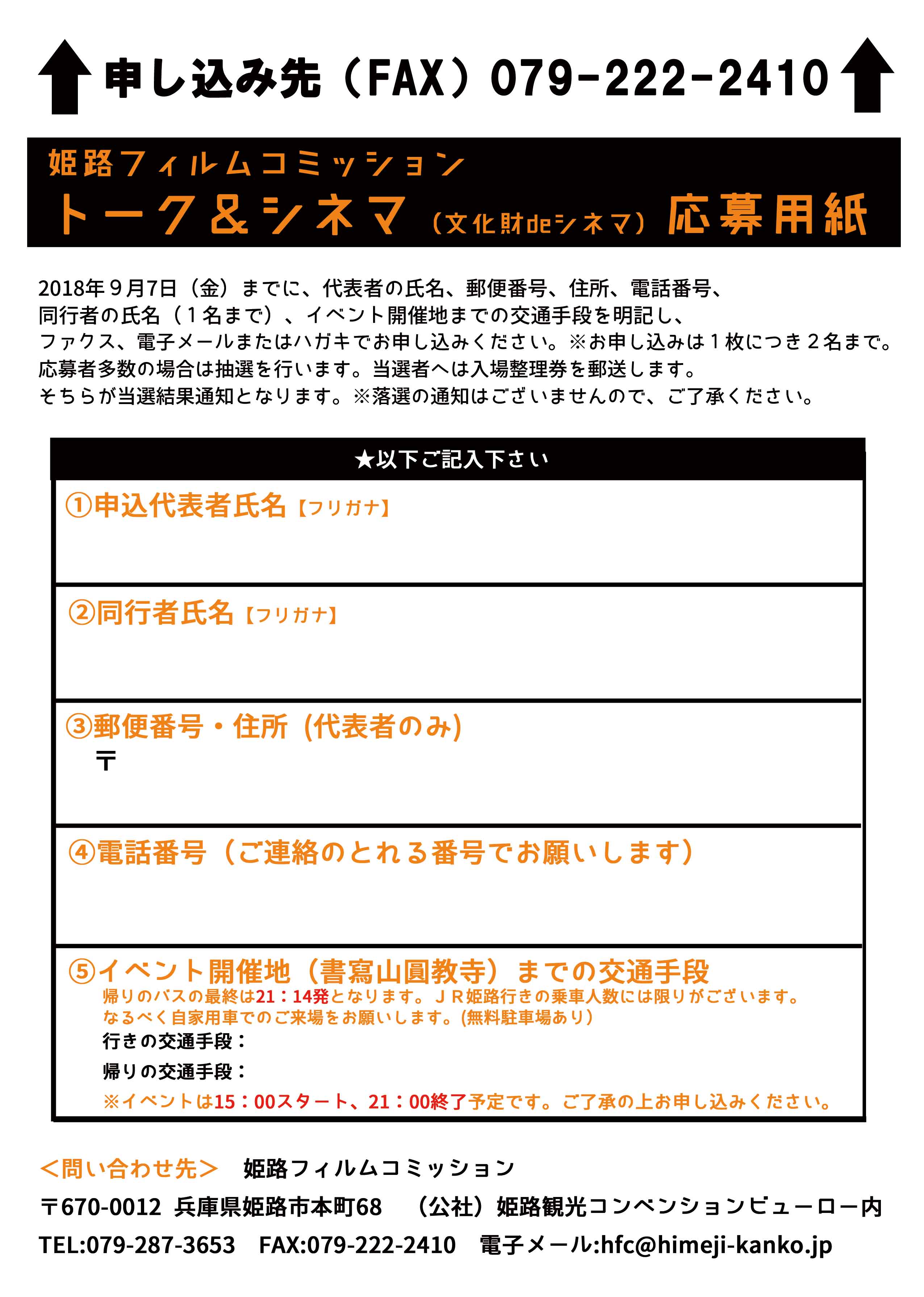 平成30年9月7日(金)までに、代表者の氏名、郵便番号、住所、電話番号、 同行者の氏名(1名まで)、イベント開催地(圓教寺)までの行き帰りの交通手段を明記し、はがき、ファクスまたは電子メールで申込み。
