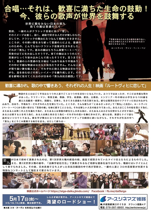 小さな日常から抜け出すために、そして病と向き合うために…。それぞれの思いを胸に歩み出す。ドイツ語も読めない人々が、アマチュア合唱団に通いながら歌を学び舞台に立つために奮闘する、第九を通じて結ぶドキュメンタリー映画です。姫路駅前で撮影された感動的な「あるシーン」を是非劇場にてご覧ください。