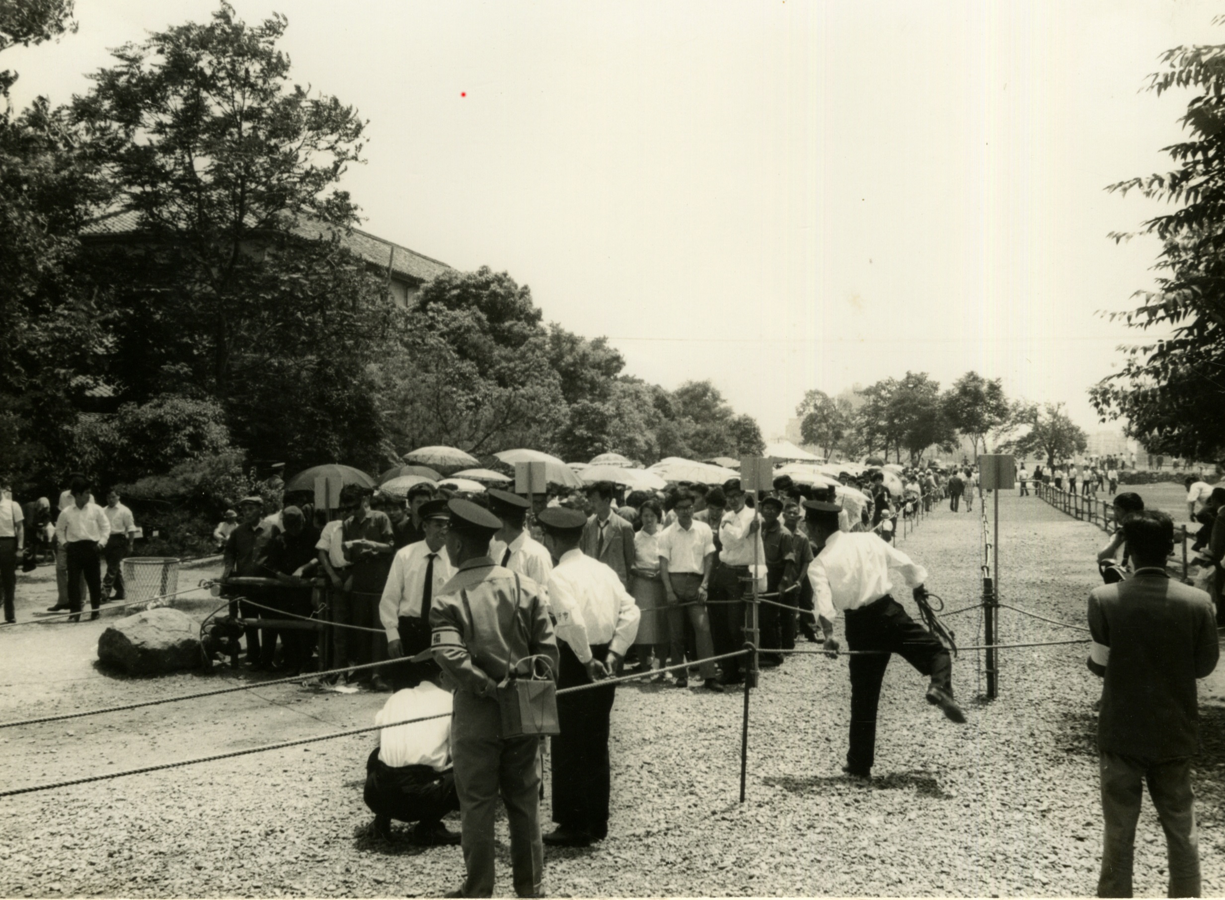 姫路城昭和の大修理工事が完了したのは昭和39年(1964)3月31日でした。待望の一般公開はその年の6月1日から開始されました。写真4は三の丸本城跡で入城を待つ登閣者の行列で、平成の修理直前と直後に長蛇の列ができたことを彷彿させます。このように、新装なった姫路城には多くの登閣者が訪れたため、連日登閣制限をせざるを得なかったのでした。